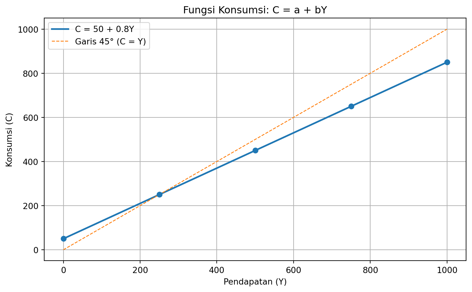 Garis ini sangat penting sebagai garis referensi atau perbandingan. Di setiap titik pada garis ini, Konsumsi (C) sama persis dengan Pendapatan (Y). Artinya, seluruh pendapatan habis digunakan untuk konsumsi, tidak ada yang ditabung (tabungan = 0).