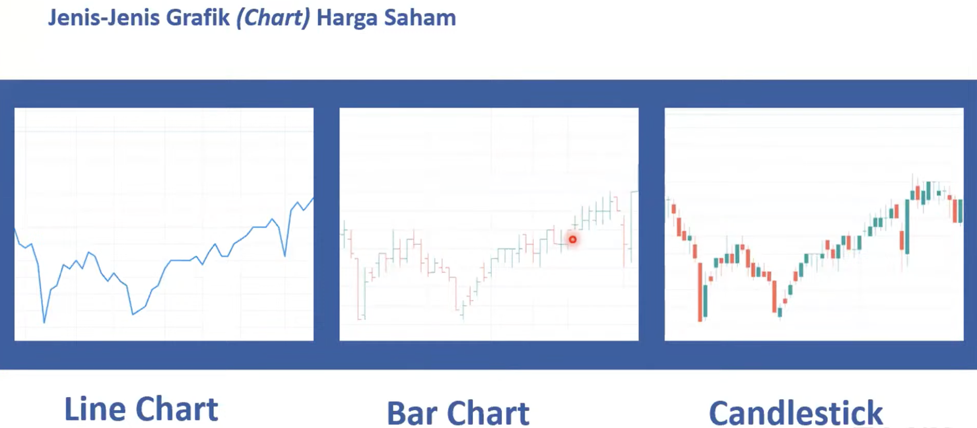 Dibuat dengan menghubungkan harga penutupan setiap periode menjadi garis kontinu. Mudah dibaca, tetapi informasi terbatas.Bar Chart